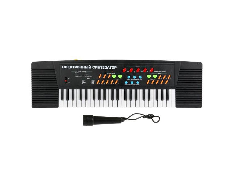 Электронный синтезатор Играем вместе – прекрасный подарок для маленького музыканта: 44 клавиши, 8 ритмов, демо-мелодии, звуки 8 музыкальных инструментов, функции записи и воспроизведения, регулировка громкости, переключатель «Вкл. /Выкл. », микрофон, эффекты ударных инструментов, режим обучения, автоматический переход в «спящий режим».