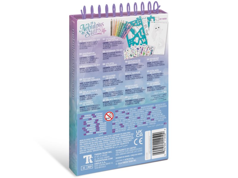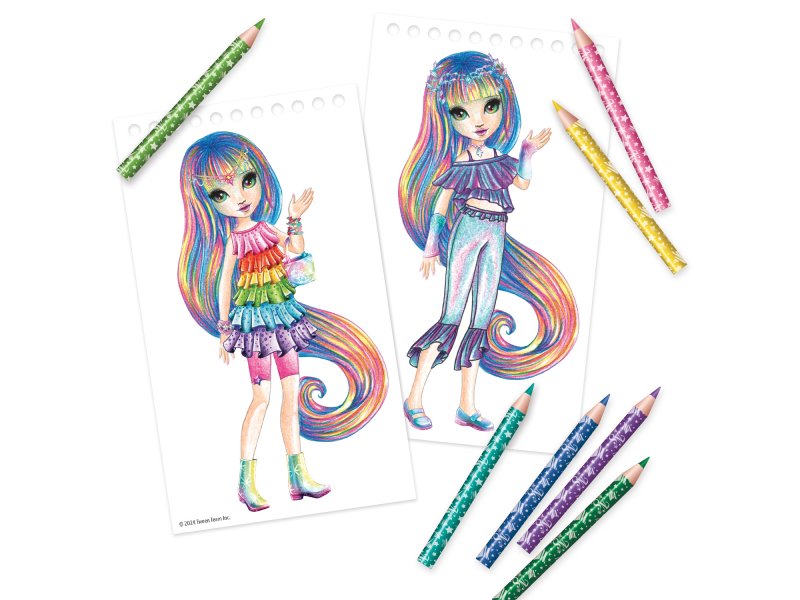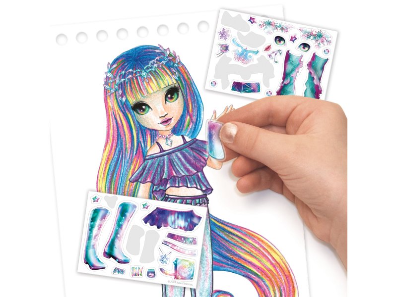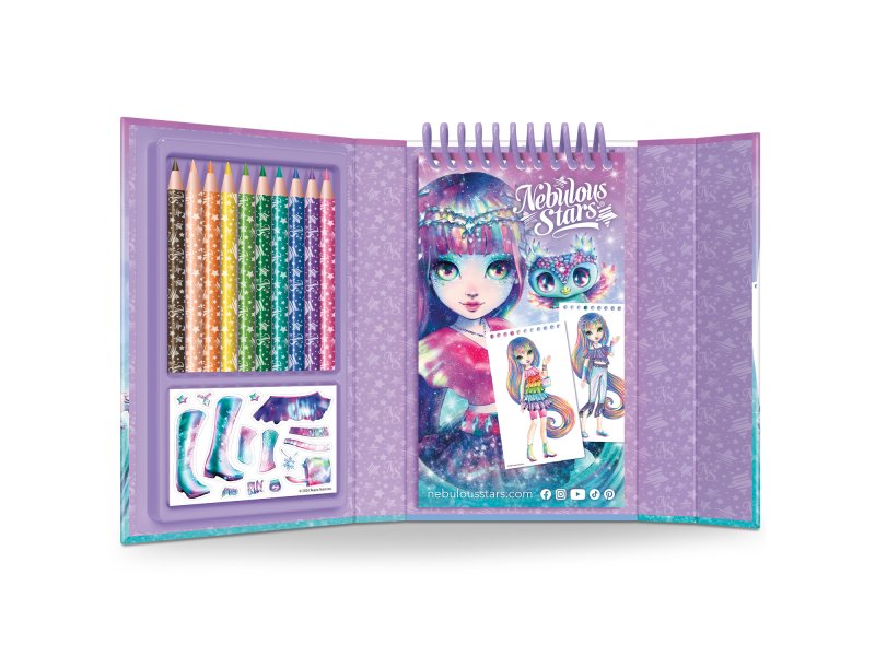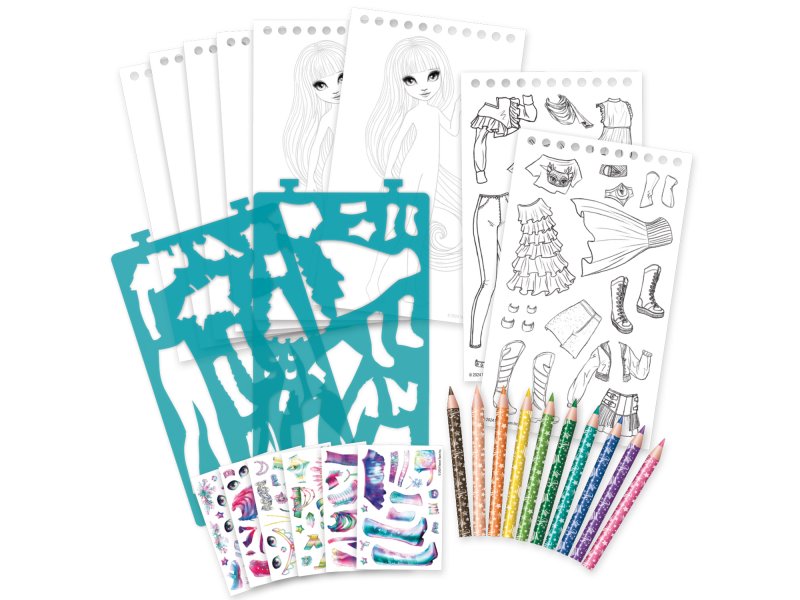 Комплектация: 20 страниц для создания эскизов, 2 страницы с трафаретами, 6 страниц с мини-стикерами 10 цветных карандашей, инструкция.