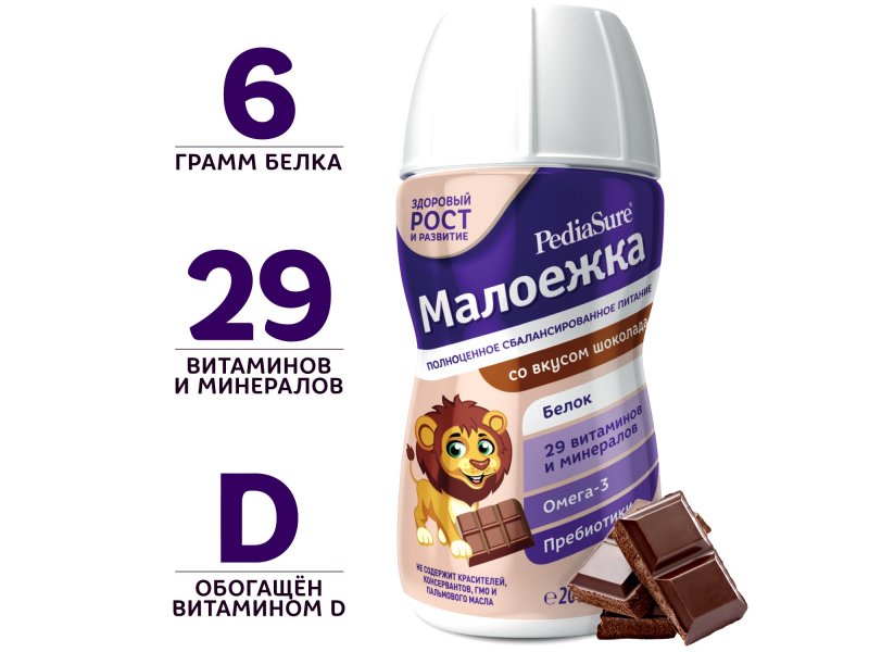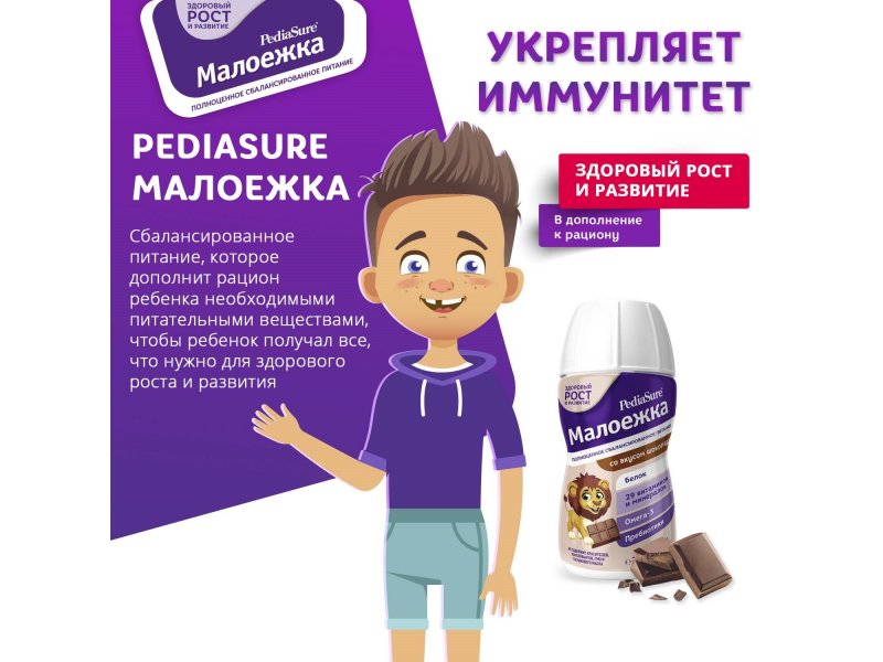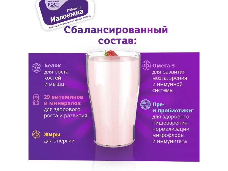 • Сбалансированный состав — в упаковке ПедиаШур содержится 8,4 г белка, продукт обогащен 14 витаминами и 15 минералами (включая хром, селен и йод)