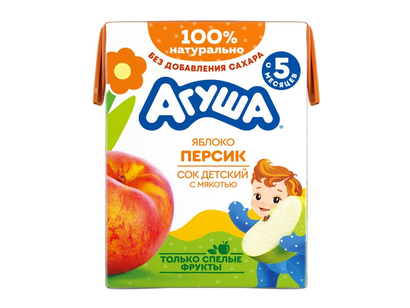 Сок Агуша с мякотью яблоко-персик - полезный и очень вкусный. Все продукты Агуша приготовлены исключительно из натуральный ингридиентов. Товар сертифицирова, не содержит красителей и консервантов.