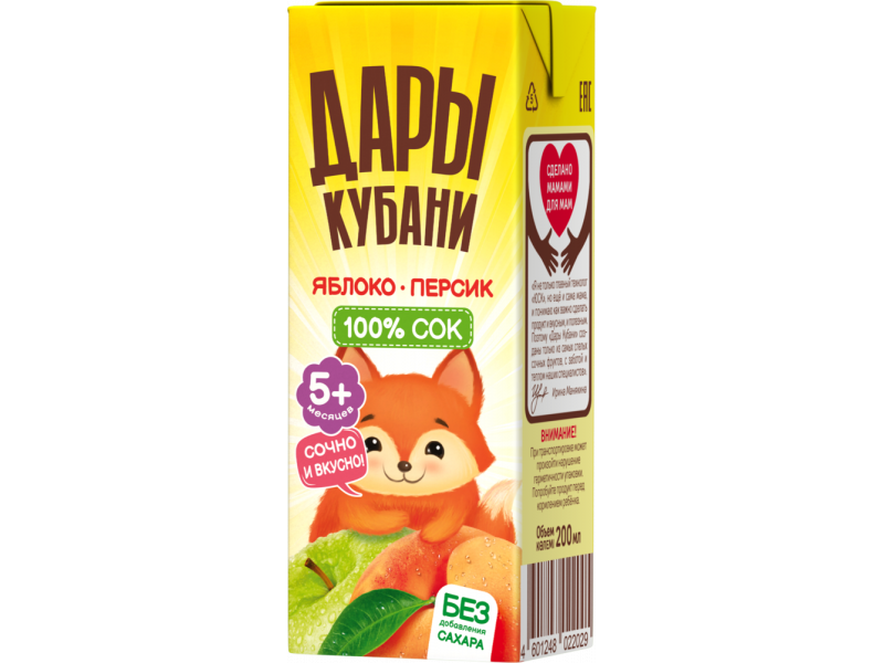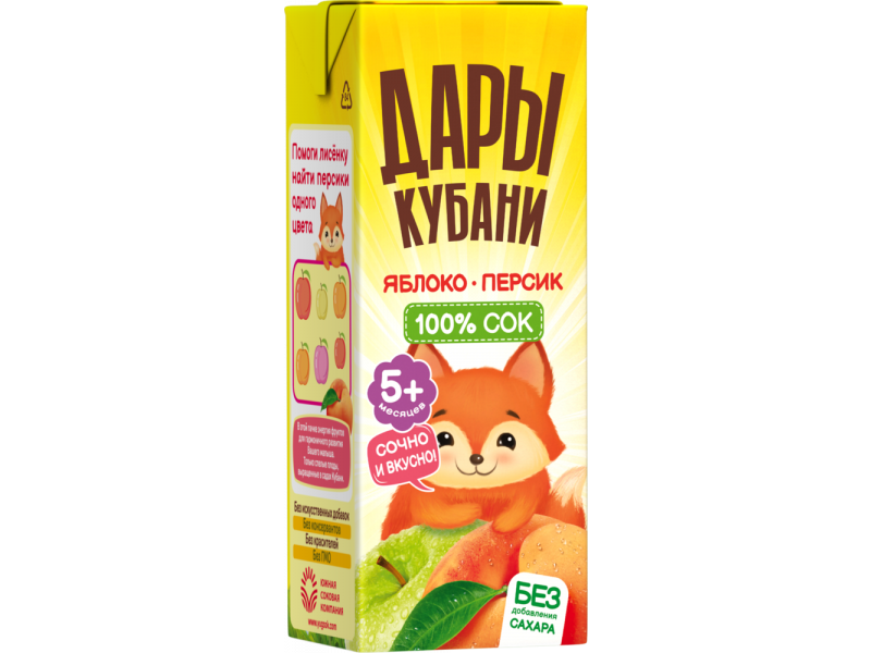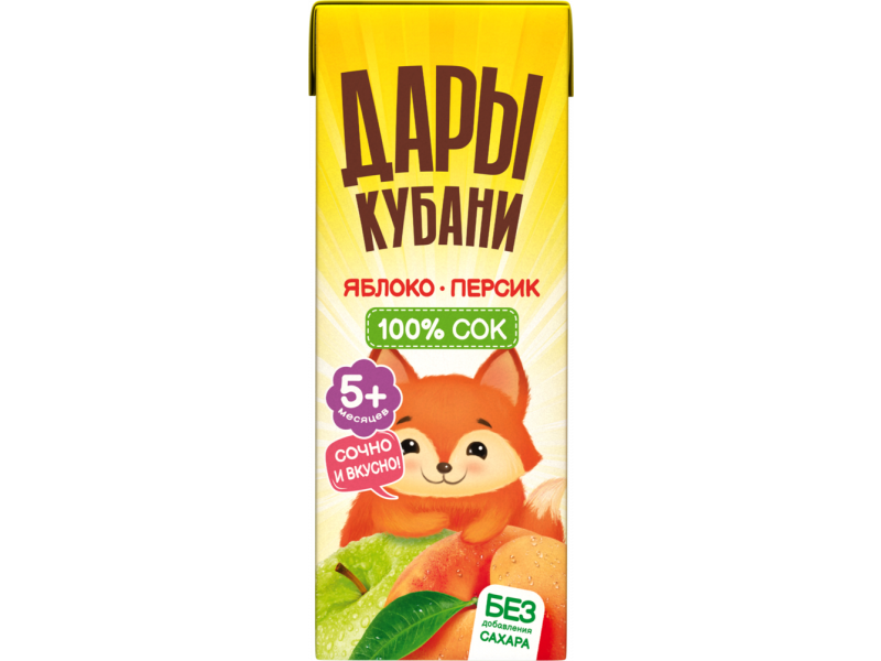100% сок. Изготовлен из яблочного сока и персикового пюре без добавления сахара.