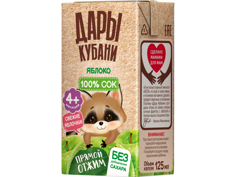 Сок Дары Кубани яблочный прямого отжима осветленный 125 мл