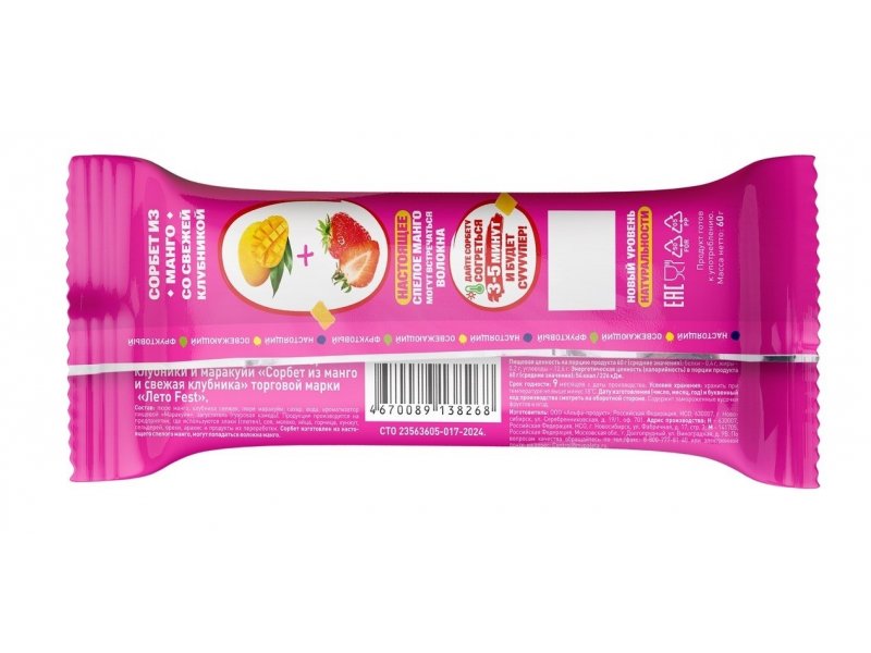 Состав: пюре манго, клубника свежая, пюре маракуйи, сахар, вода, ароматизатор пищевой "Маракуйя", загуститель (гуаровая камедь). Продукция производится на предприятии, где используются злаки (глютен), соя, молоко, яйца, горчица, кунжут, сельдерей, орехи, арахис и продукты их переработки. Сорбет изготовлен из настоящего спелого манго, могут попадаться волокна манго.