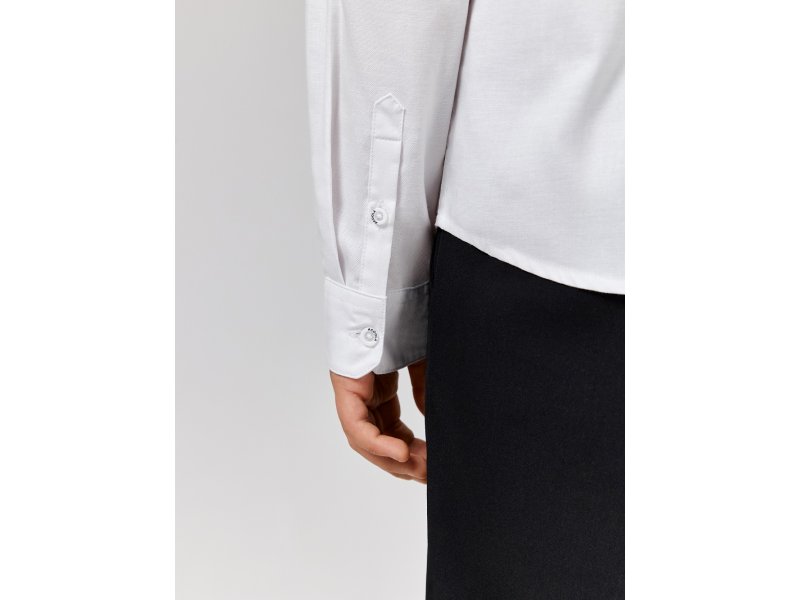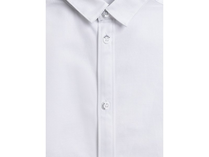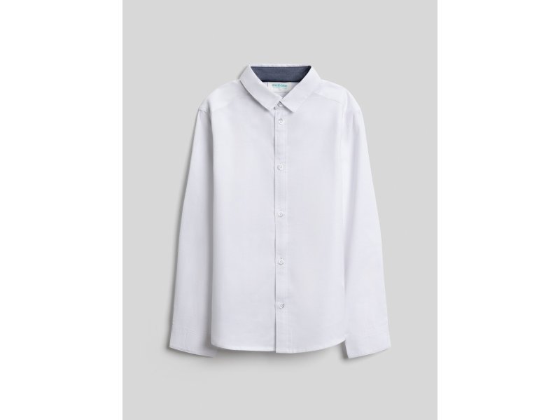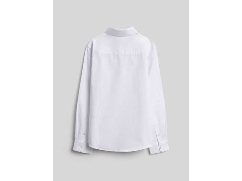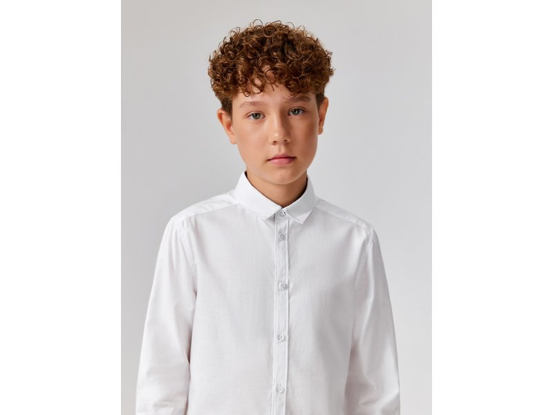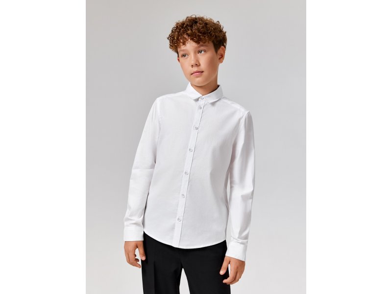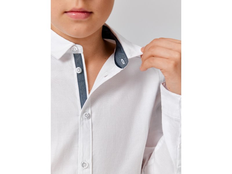 Детская рубашка с длинным рукавом для мальчика выполнена из хлопковой ткани, что создает приятные ощущения на коже во время ношения. Модель прямого силуэта обеспечивает комфортную посадку по фигуре. Застежка на петли и брендированные пуговицы помогает при одевании; центральная планка с контрастной отделкой. Рубашка с длинным рукавом подходит для ношения в любую погоду. На спинке расположена силуэтообразующая кокетка. Стояче-отложной воротник с контрастной вставкой придает изделию завершенный и строгий вид. Модель представлена в двух цветах: белом и голубом. Рубашка может стать базой для школьной формы.