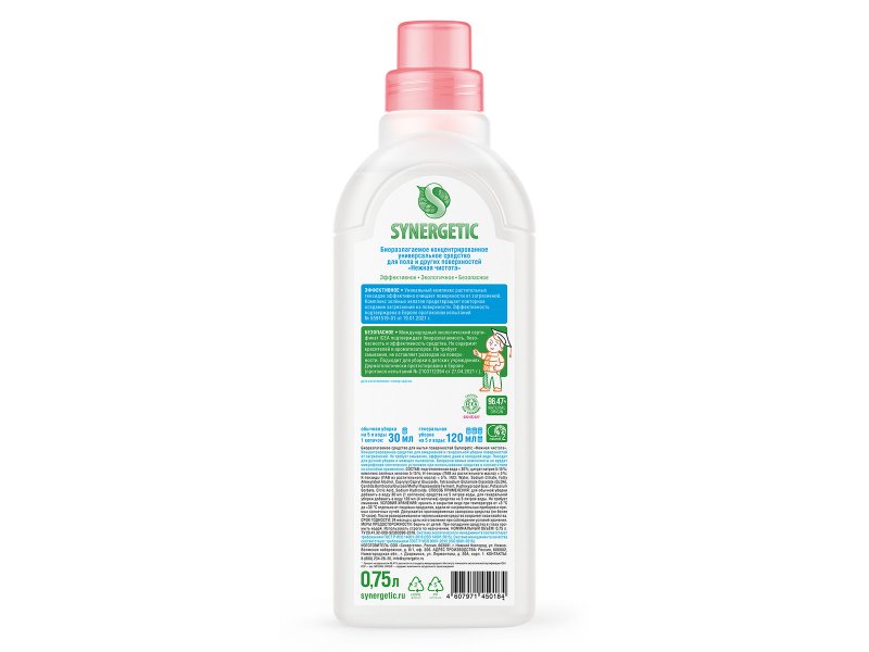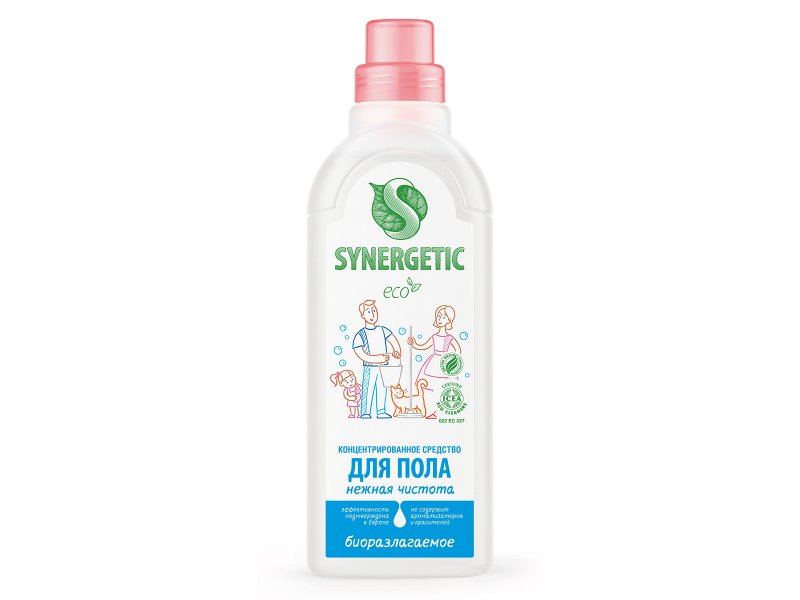 Средство Synergetic универсальное для мытья поверхностей (для пола) Нежная чистота. Универсальное средство для легкой или генеральной уборки пола и других поверхностей: столов, стен и даже потолка. Не нужно смывать! Идеально для паркета и ламината, плитки и линолеума, камня и металла, стекла и пластика, дерева и обоев. Подходит для ручной уборки и при чистке моющим пылесосом. Эффективно убирает грязь и не убивает ваше время! Без красителей и ароматизаторов.