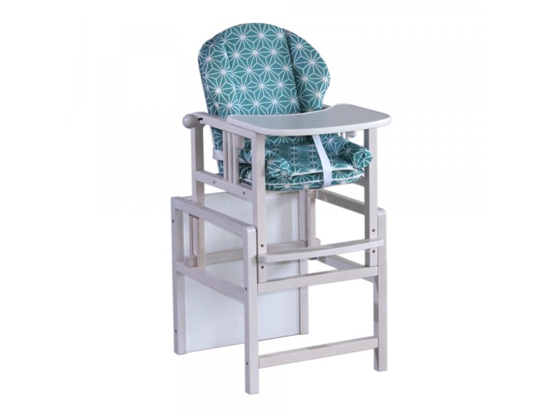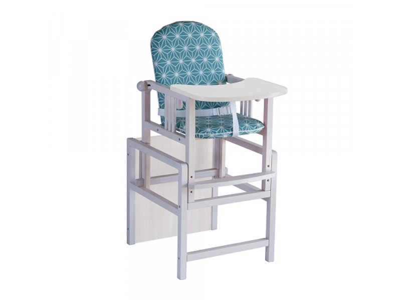У стульчика предусмотрена независимая подножка, которую можно прикрутить в трех разных по высоте положениях. Аккуратные реечные боковины стульчика особенно актуальны в этой глубокой модели. Сиденье и спинка обиты водоотталкивающим материалом.