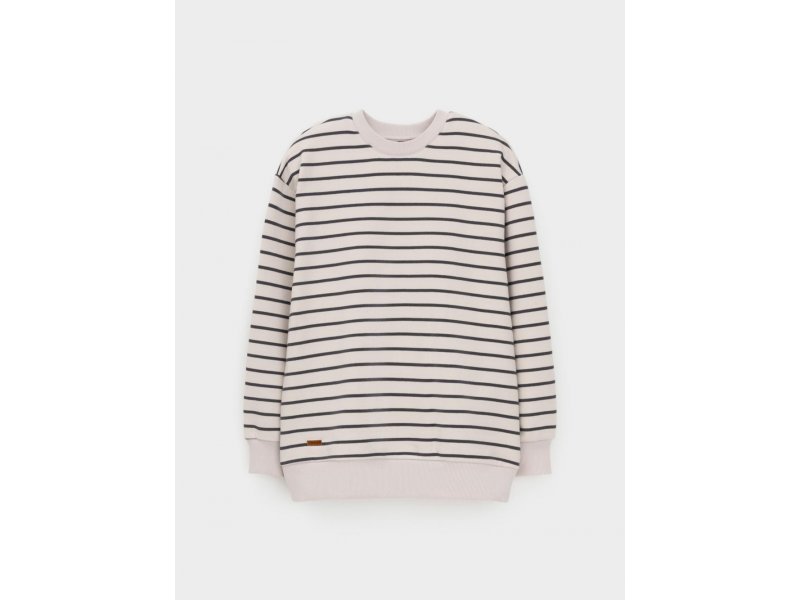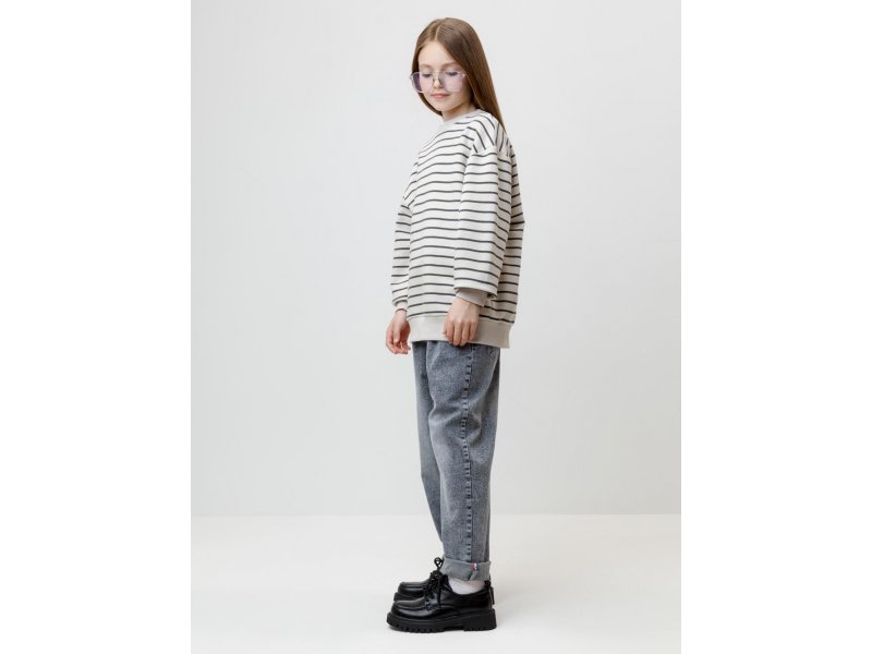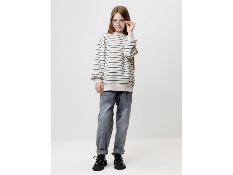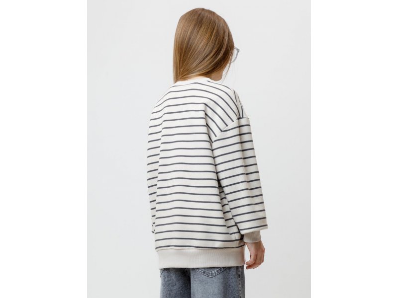 Свитшот в полоску для девочки из гладкого петельчатого футера трёхнитки. В составе 80% натурального хлопка и 20% полиэстера, при этом полиэстер ввязан внутрь по особой технологии и не соприкасается с кожей. Пояс и манжеты выполнены из мягкого эластичного трикотажа. Изделие сохраняет форму и стойкий цвет после многочисленных стирок и идеально подходит на каждый день. Оригинальный принт выполнен из стойких текстильных гипоаллергенных красителей. Все трикотажные полотна производятся в соответствии с нормами швейцарского сертификата ЭкоТекс.