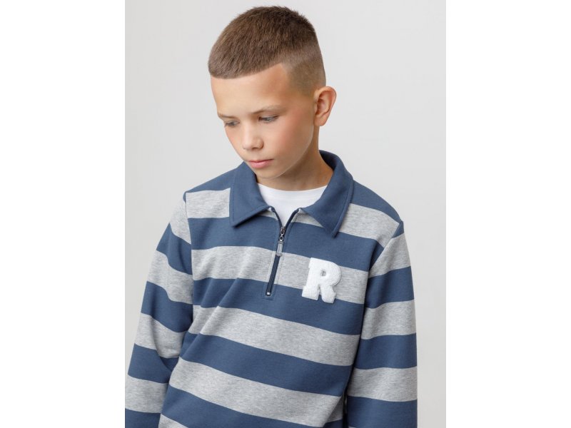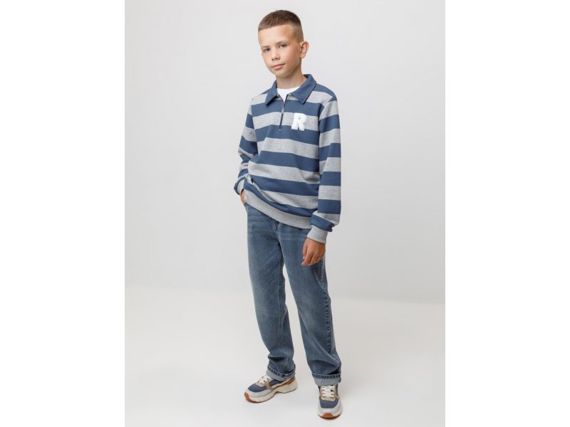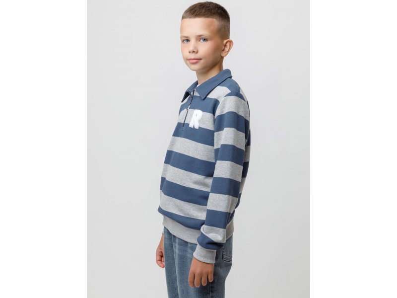 Свитшот с воротником для мальчика. Изготовлен из высококачественного петельчатого футера. В составе 80% натурального хлопка и 20% полиэстера, при этом полиэстер ввязан внутрь по особой технологии и не соприкасается с кожей. Манжеты и пояс выполнены из эластичного полотна. На груди короткая застёжка на молнию. Оригинальный рисунок выполнен из стойких текстильных гипоаллергенных красителей. Изделие сохраняет цвет и форму после многократных стирок.