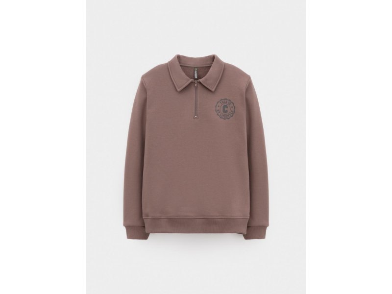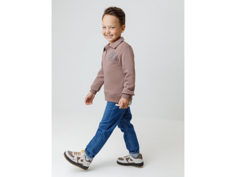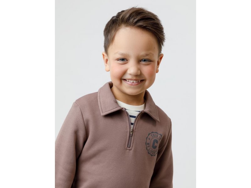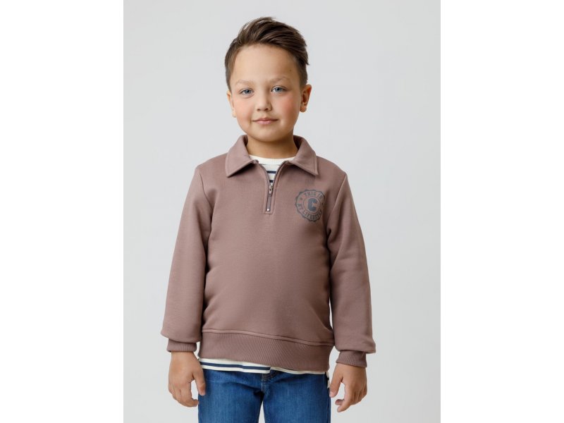 Свитшот с воротником для мальчика. Изготовлен из высококачественного петельчатого футера. В составе 80% натурального хлопка и 20% полиэстера, при этом полиэстер ввязан внутрь по особой технологии и не соприкасается с кожей. Манжеты и пояс выполнены из эластичного полотна. На груди короткая застёжка на молнию. Оригинальный принт выполнен из стойких текстильных гипоаллергенных красителей. Изделие сохраняет цвет и форму после многократных стирок.