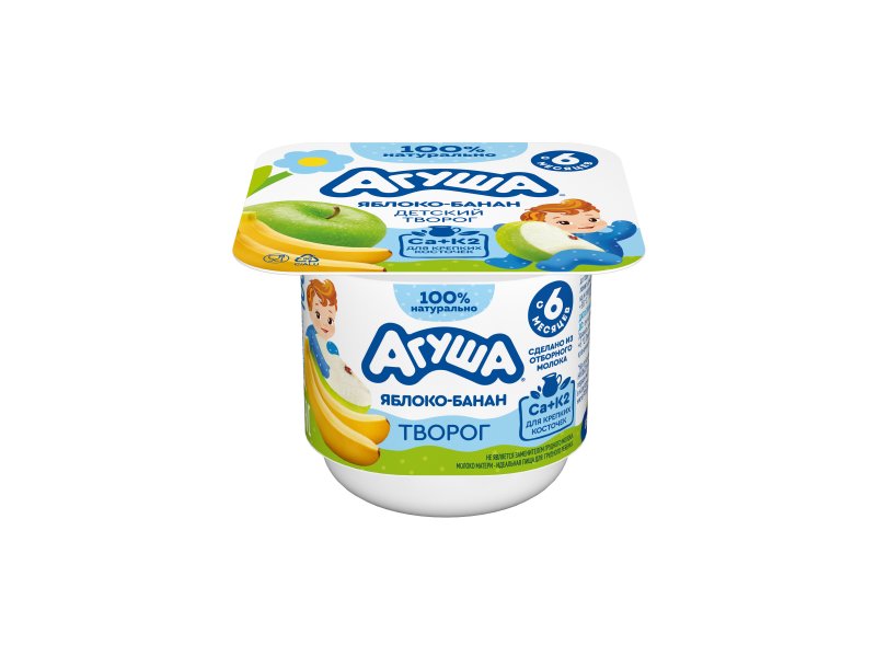 Фрутовый творожок Агуша с бананом и яблочком произведен из натурального коровьего молока с использованием специальной технологии, позволяющей сохранить все полезные свойства продукта. Обладает особенно нежной консистенцией. Может входить в меню детей старше 6 месяцев.