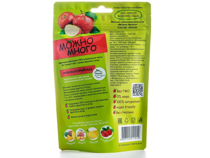 Вы влюбитесь в них с первого кусочка, с первого взгляда! Яблоко сублимированное "Можно Много" - это 100% натуральные хрустящие чипсы сублимационной сушки в удобной упаковке. 100% натурально, без глютена и ГМО. 0% жира. Сохранены польза и витамины свежих фруктов и ягод без добавок и консервантов.
