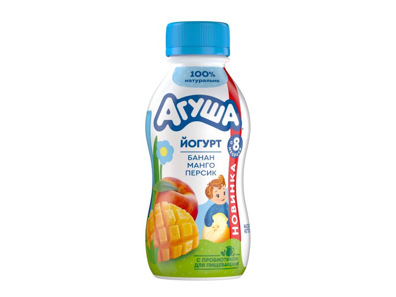 Йогурт фруктовый с бананом, манго и персиком, обогащенный пробиотическими микроорганизмами, с массовой долей жира 2,7 % предназначен для питания детей старше 8 месяцев.