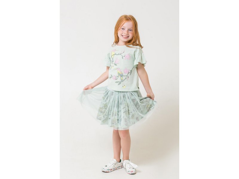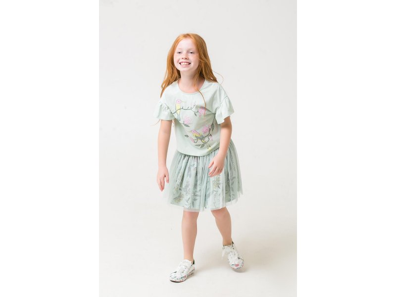 Нарядная юбочка Crockid из трикотажа и верхней сетки с напылением. Широкий серебристый пояс сочетается с дымчатым цветом сетки и основного полотна. Продукция изготовлена из натуральных материалов самого высокого качества, поэтому не вызывает аллергии и не вредит здоровью ребенка, устойчива к стирке, долго сохраняет цвет и форму.