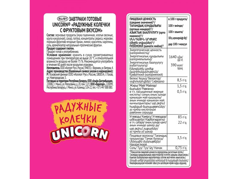 Готовый завтрак Unicorn Радужные колечки с фруктовым вкусом 195 г