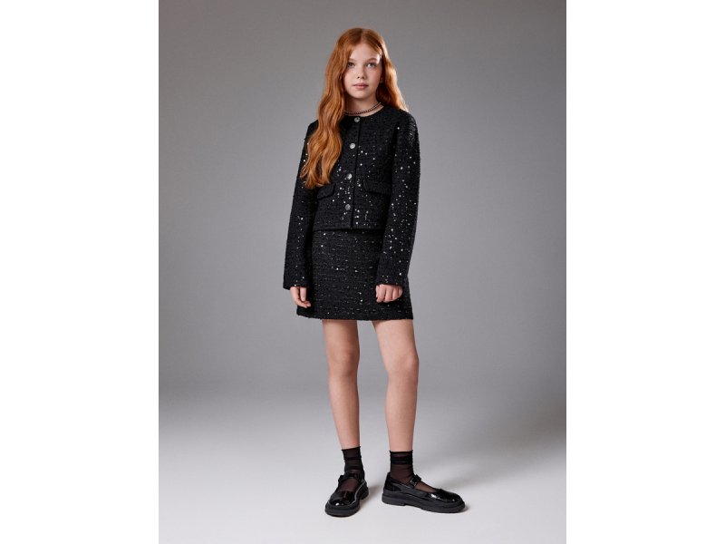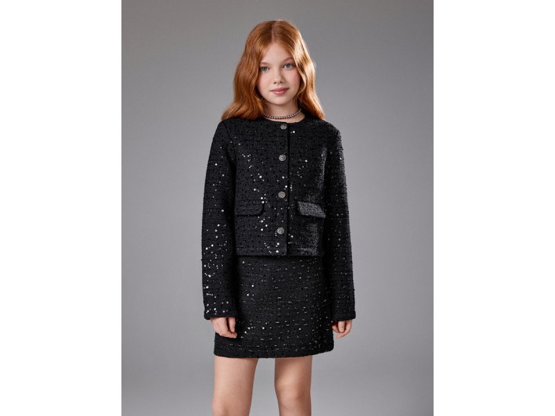 Жакет для девочки-подростка — искрометная модель из новогодней коллекции, призванная разнообразить гардероб. Модель прямого кроя подходит для разных типов фигуры. Спереди расположена центральная застежка на блестящие пуговицы. Практичности модели добавляют расположенные спереди действующие карманы с клапанами. Длинные рукава также дополнены декоративными пуговицами. Блестящий жакет создает утонченный образ и подчеркивает чувство вкуса. Созданный аутфит прекрасно подойдет для новогодней вечеринки, ёлки, рождественского торжества или семейных праздников.