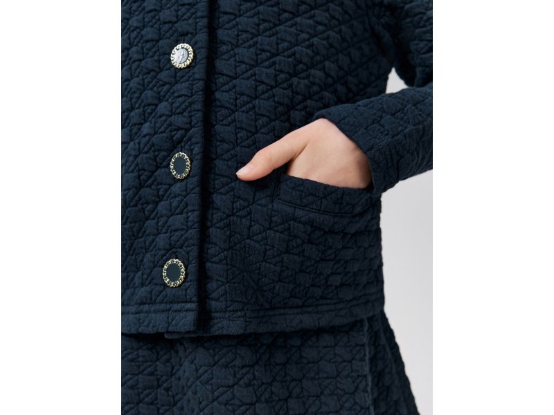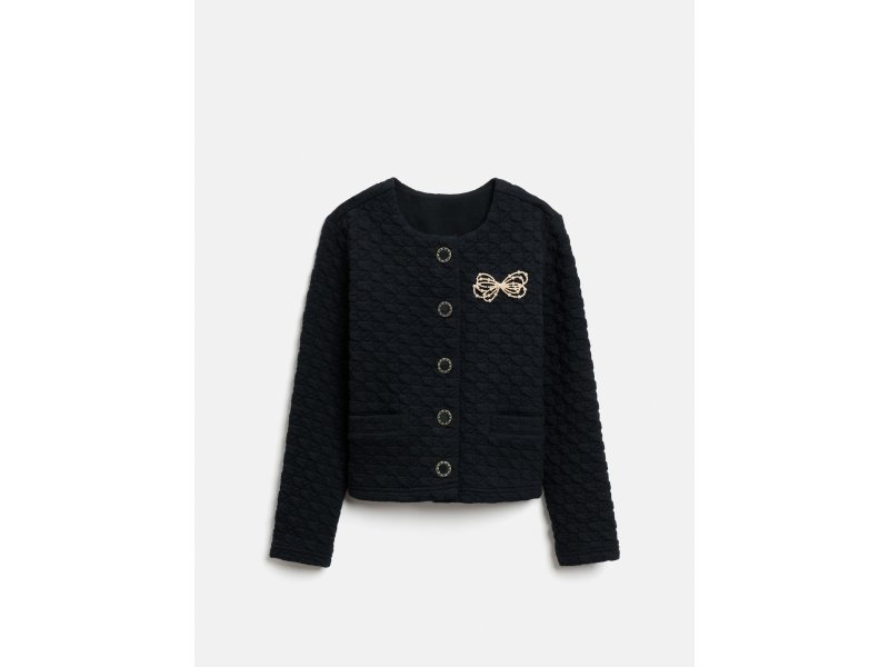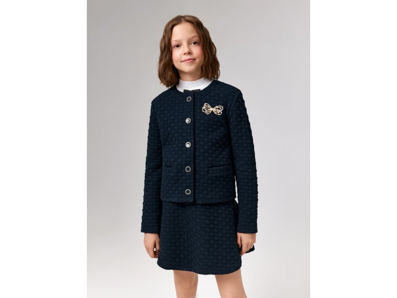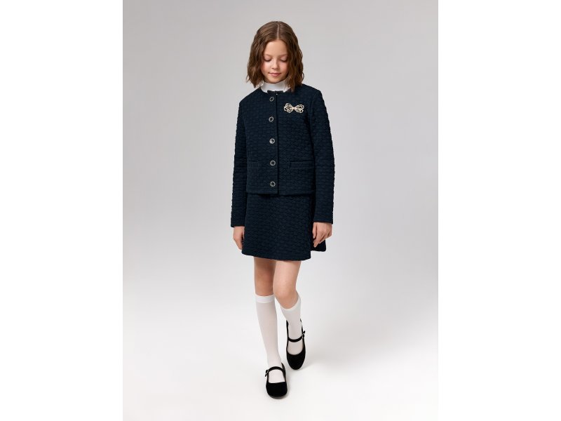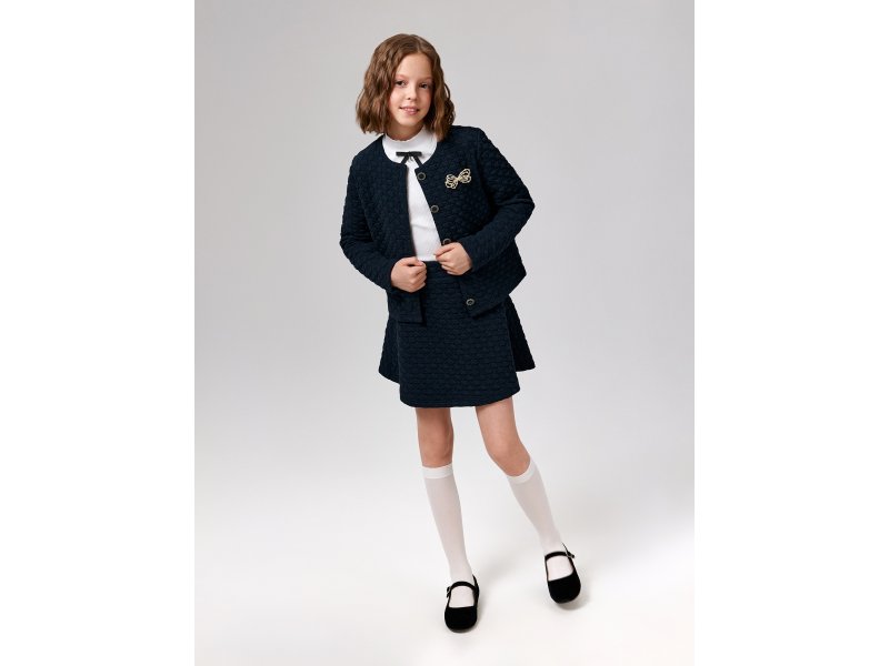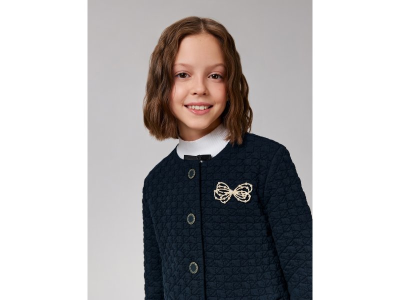 Детский школьный Жакет Acoola на пуговицах для девочки выполнен из плотного и мягкого трикотажа с рельефным рисунком, добавляющим модели визуального интереса. Темно-синий Жакет Acoola прямого силуэта со стандартной линией плеч обеспечивает классическую посадку по фигуре. Спереди расположена застежка на крупные акцентные пуговицы, которая облегчает одевание. Практичности модели добавляют расположенные по бокам функциональные карманы. Изящный акцент вносит пришитая металлическая брошь на груди, украшенная бусинами. Глубокий темно-синий цвет изделия соответствует деловому дресс-коду и легко сочетается со школьной формой.