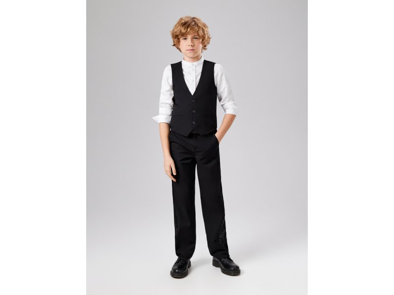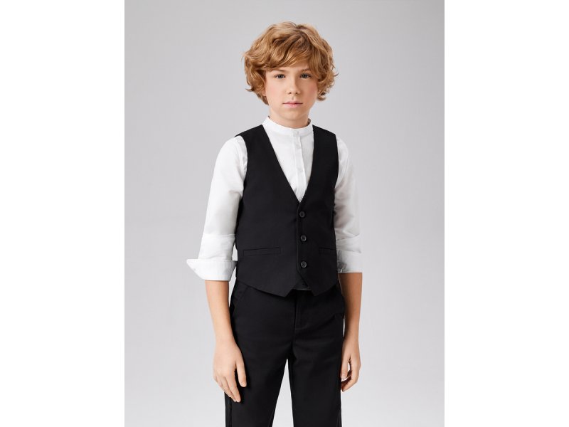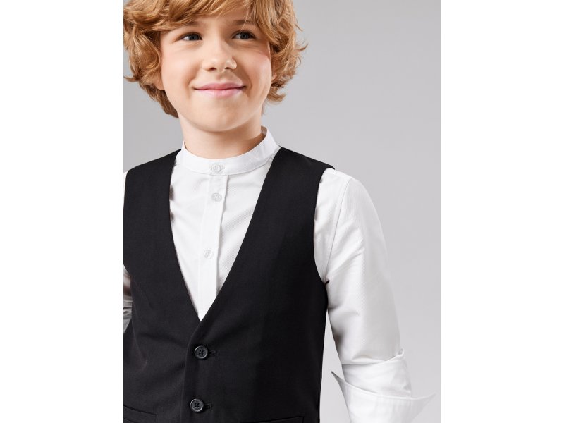 Строгий жилет для мальчиков на пуговицах из костюмной ткани. Спреди прорезные карманы. Жилет придаст торжественности праздничному образу с классическими брюками.