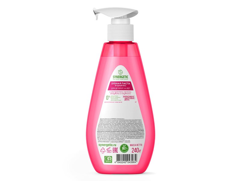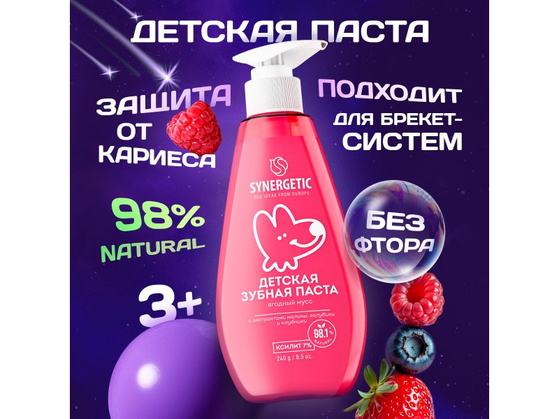 Детская зубная паста SYNERGETIC "Ягодный мусс" - это эффективная и безопасная зубная паста с нежным вкусом ягодного мусса, которая обеспечивает профилактику кариеса и препятствует образованию налёта.